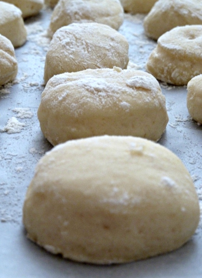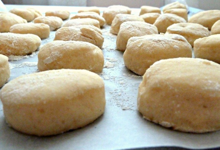 Aplatissez la boule au rouleau (bien fariné) jusqu’à une épaisseur d’environ 5 mm. Découpez des cercles avec un emporte-pièce de 5 cm, que vous déposerez sur une plaque à pâtisserie BIEN FARINEE (j’en ai perdu plein car je ne l’ai pas assez farinée et je les ai massacrés en les décollant après la deuxième pousse