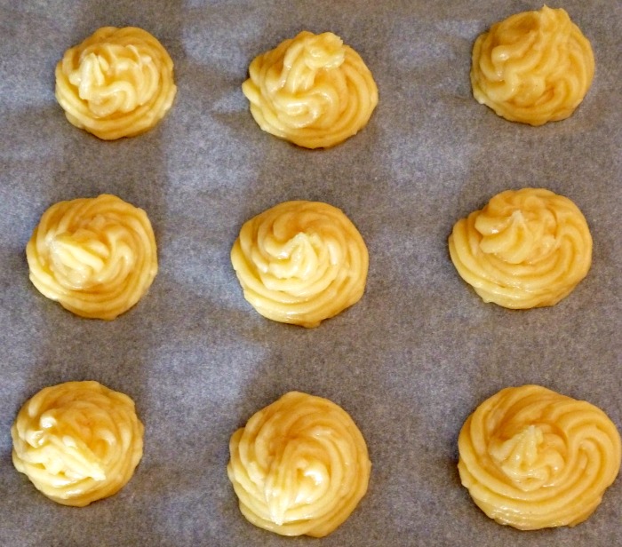Disposez des petits tas de pâte sur une plaque de cuisson recouverte de papier cuisson, à l’aide de deux petites cuillères ou d’une poche à douille.
